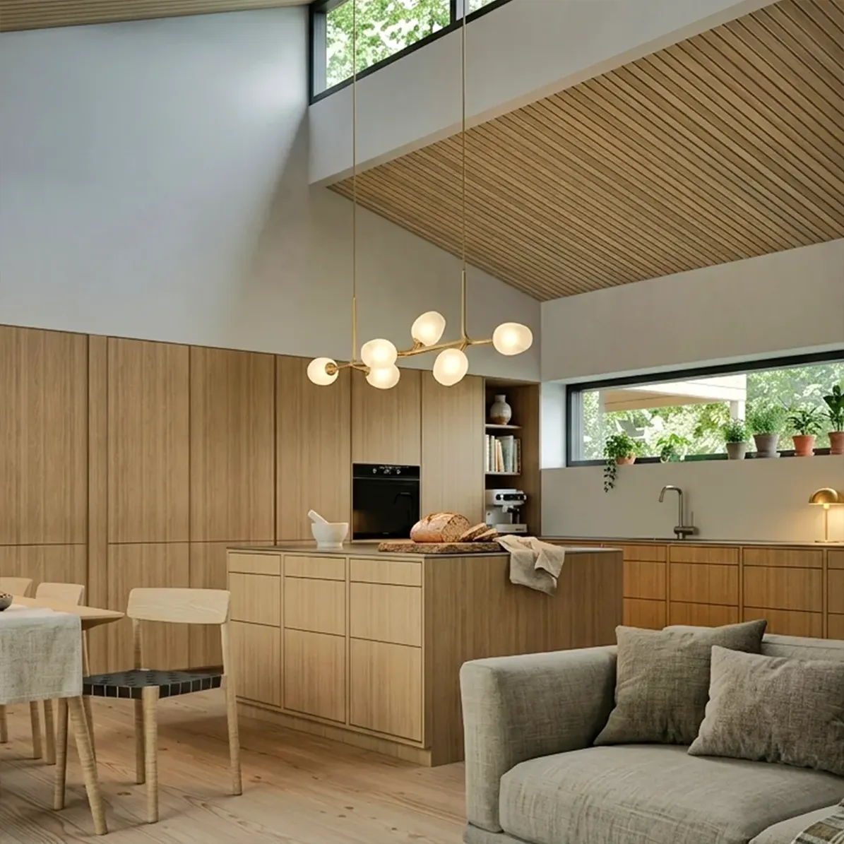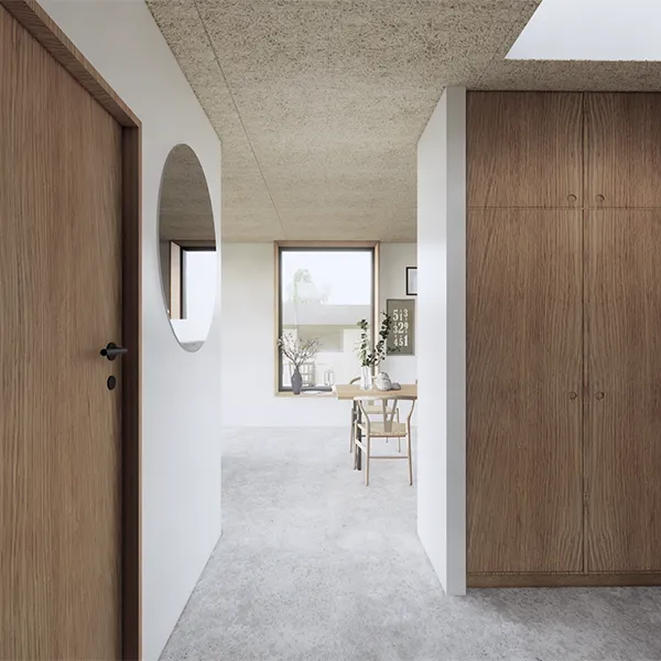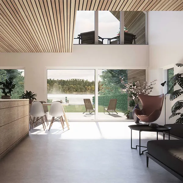 Vi tænker altid akustikken ind. Lyddæmpning, sektionering af boligen, skillevægsopbygning osv. Det skal være behageligt at opholde sig i sit hjem – ikke mindst for børnefamilier. Der er flere måde at indtænke akustik løsninger på store overflader af boligen, som lofter, vægge eller gulve.
