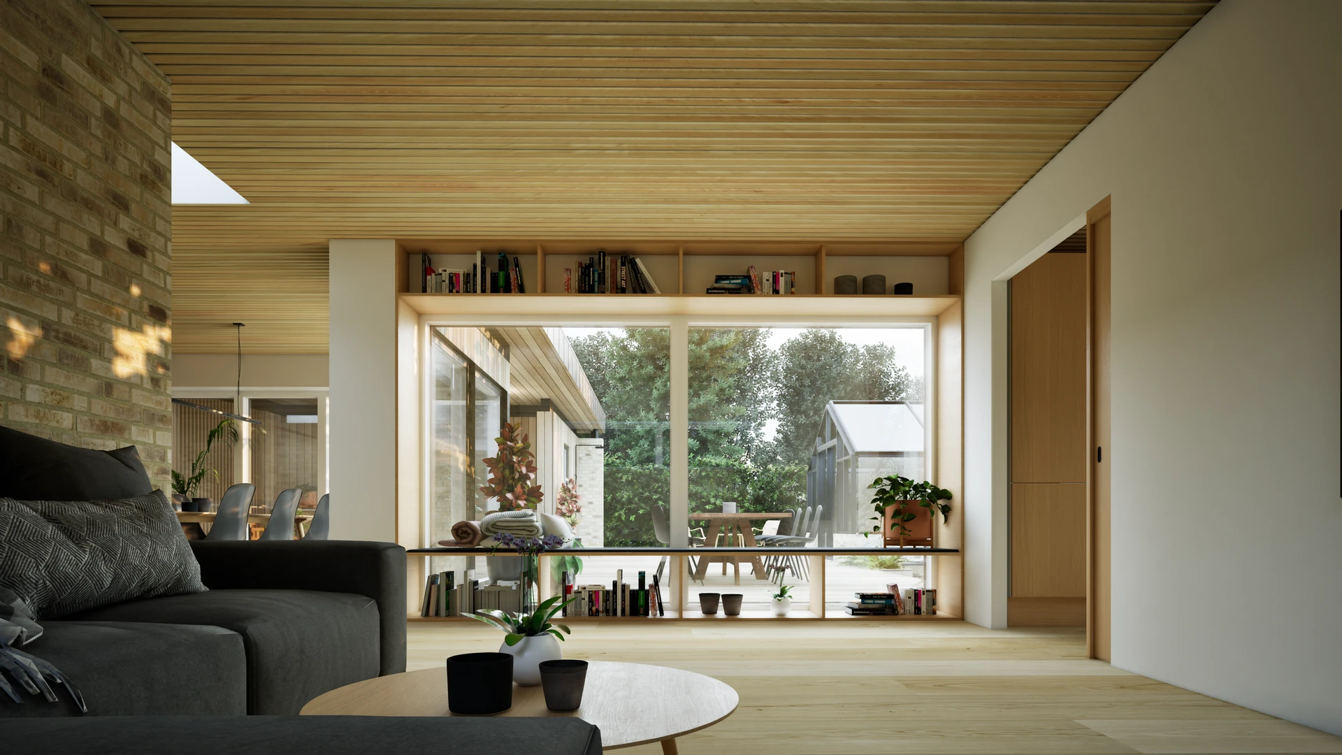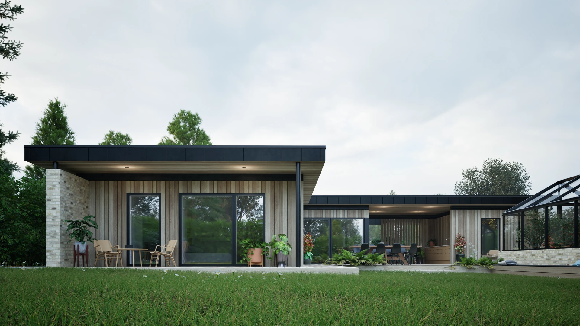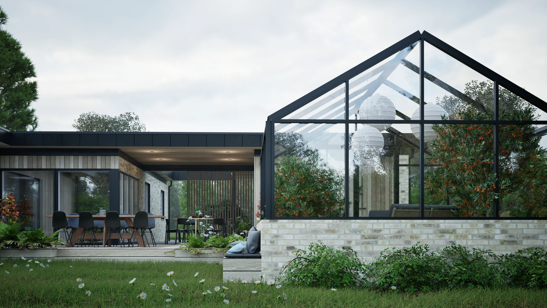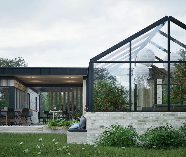 Designet integrerer desuden et stemningsfuldt atrium, der fungerer som et bindeled mellem hovedhuset og familiens nye orangeri. Resultatet er en harmonisk bolig, hvor forskydningerne ikke blot sikrer læ og privatliv, men også skaber en spændende dynamik mellem de indendørs opholdsarealer og havens uderum.
