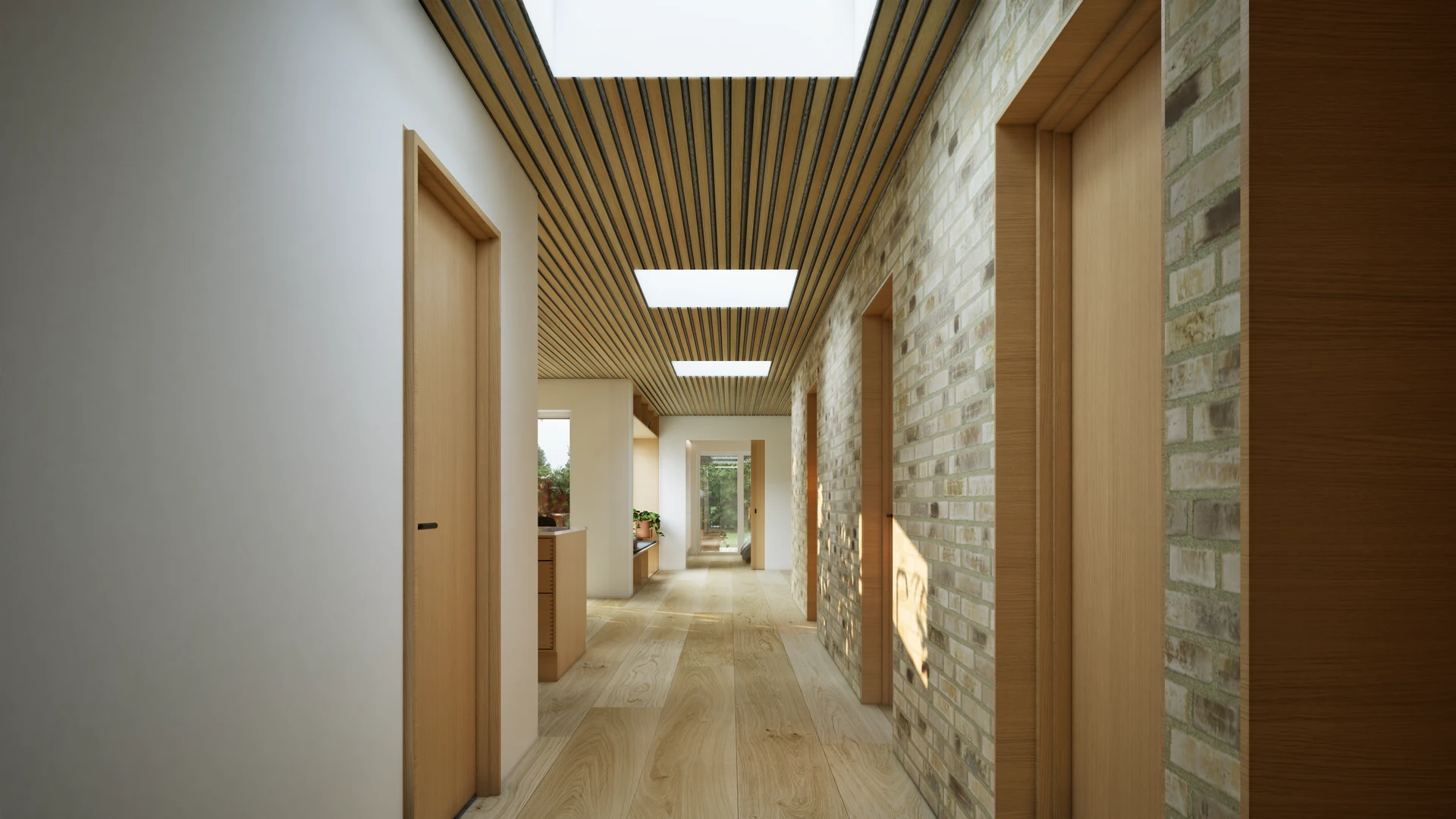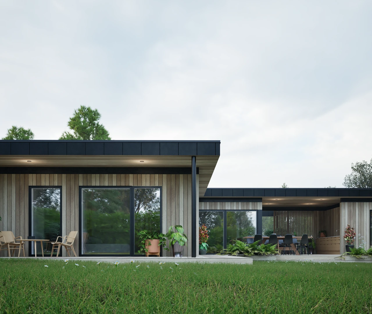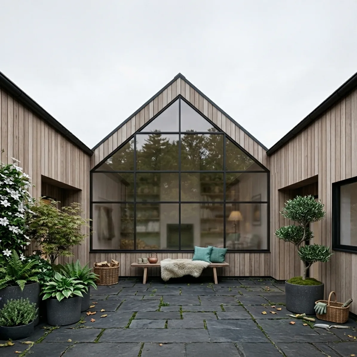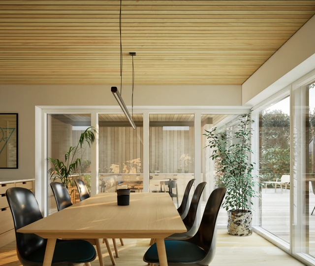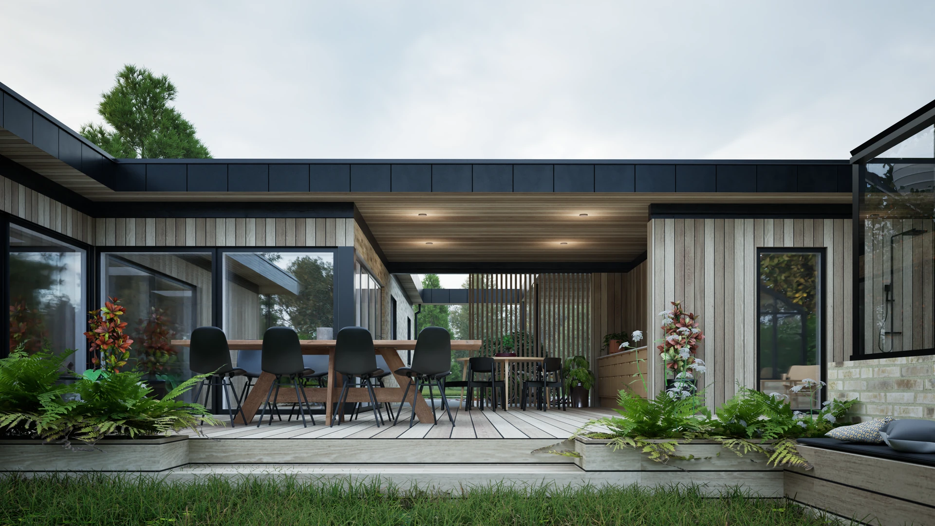 Designet integrerer desuden et stemningsfuldt atrium, der fungerer som et bindeled mellem hovedhuset og familiens nye orangeri. Resultatet er en harmonisk bolig, hvor forskydningerne ikke blot sikrer læ og privatliv, men også skaber en spændende dynamik mellem de indendørs opholdsarealer og havens uderum.