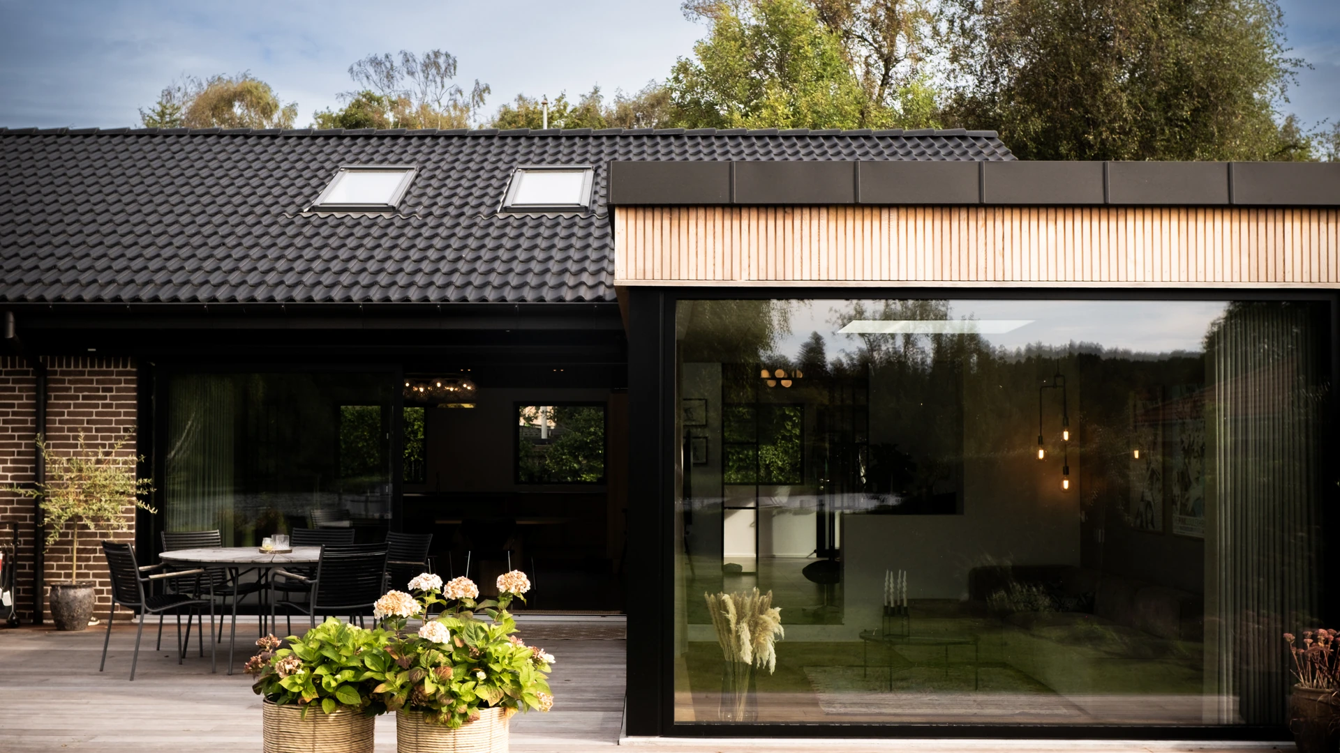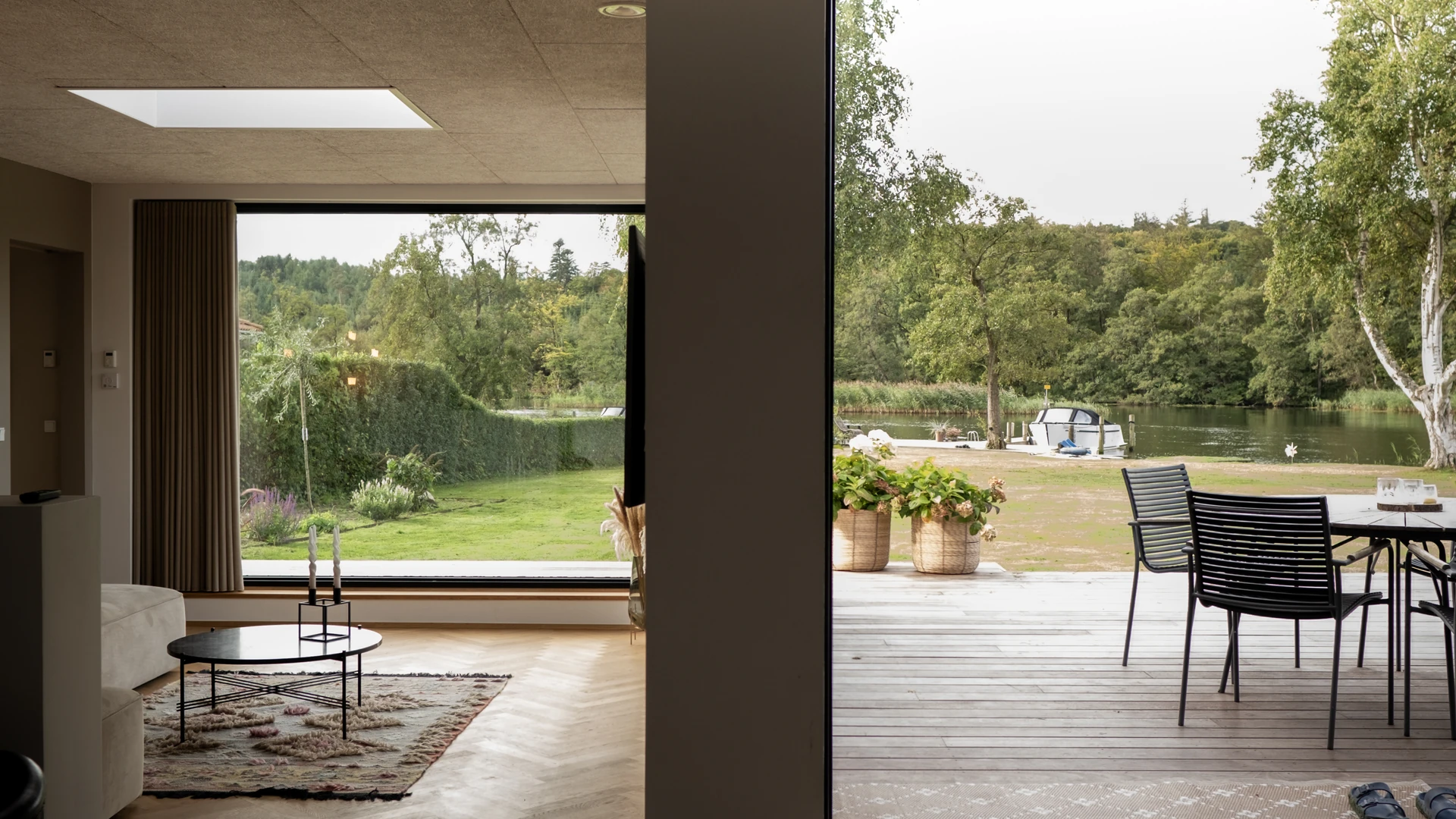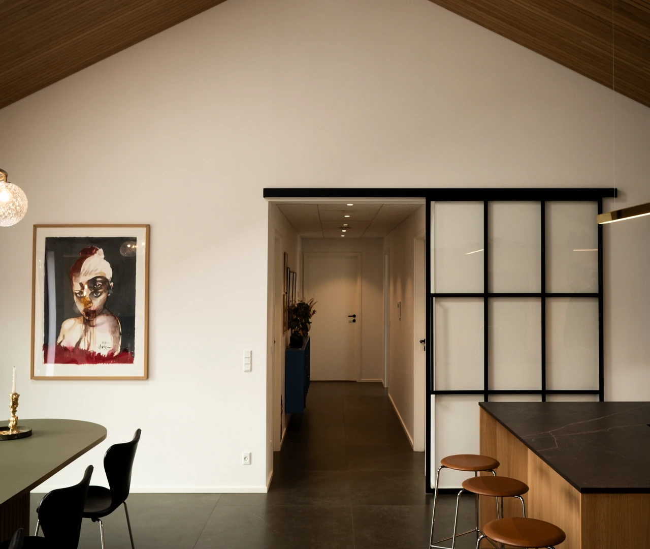 I direkte forlængelse af alrummet er etableret en ny, indbydende stue, der fungerer som bindeled til tilbygningens private forældreafdeling med eget badeværelse. Resultatet er en harmonisk bolig, hvor moderne arkitektur og funktionelle rumforløb sikrer, at familien kan nyde både samvær og de unikke naturoplevelser, som grundens placering tilbyder.