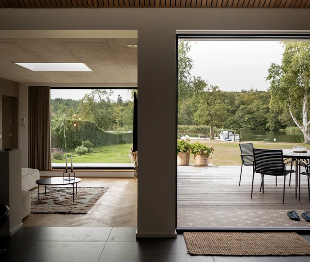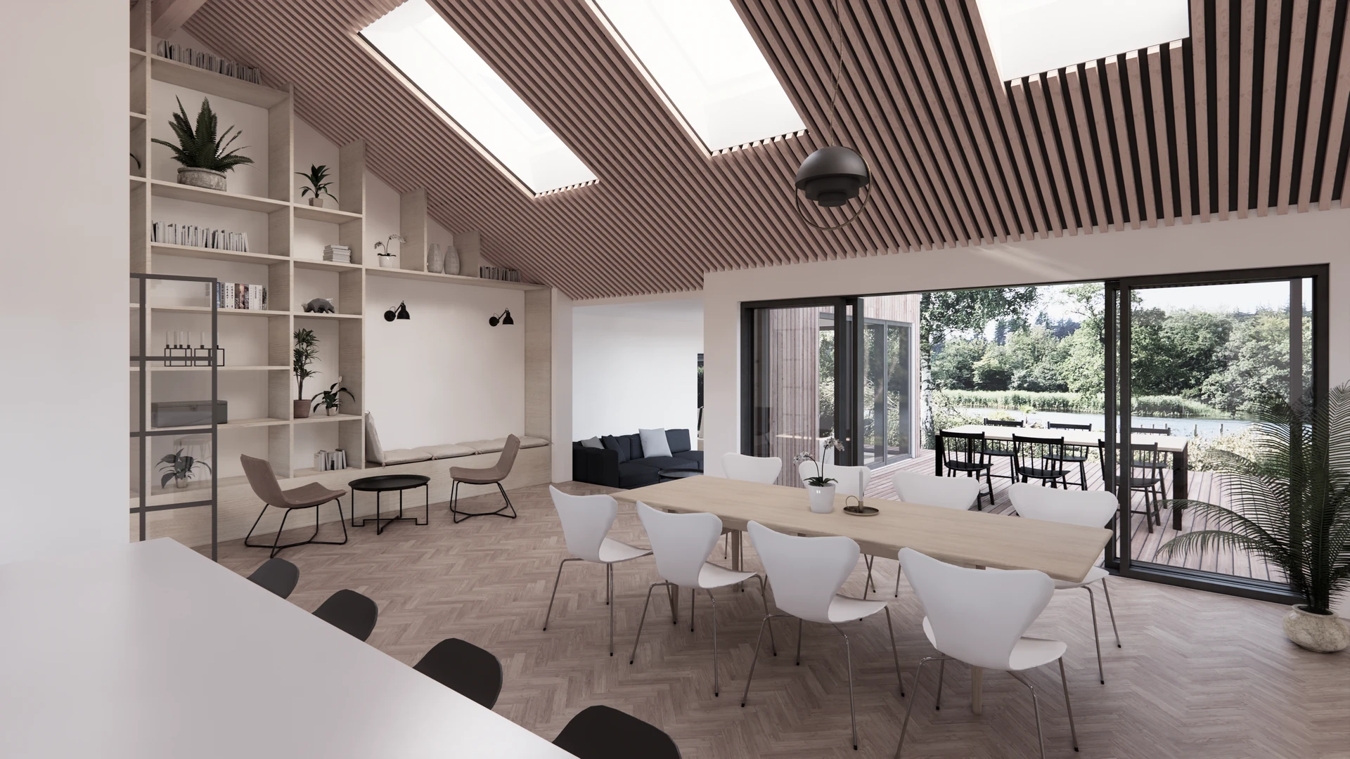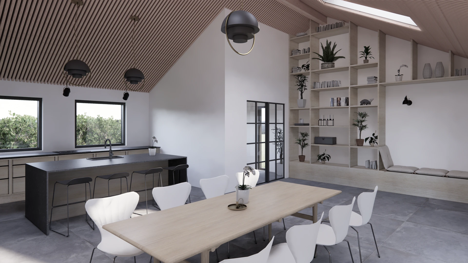 I Sejs har vi tegnet en omfattende tilbygning og renovering af Villa Havmose, der er smukt placeret ved Sejs-snævringen. Projektet centrerer sig om et nyt, lyst køkken-alrum, hvor store glaspartier maksimerer den imponerende udsigt til søen og den omkringliggende natur.