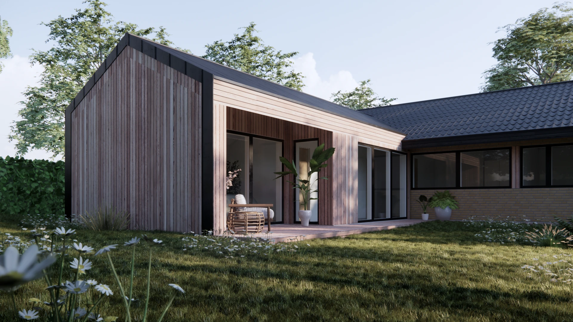 I Tranbjerg har vi forestået en omfattende totalrenovering og tilbygning af Villa Kirk. Projektet transformerer den eksisterende garage til en integreret del af boligen, der nu strækker sig naturligt ud i haven. Denne udvidelse rummer en eksklusiv forældreafdeling med direkte adgang til det fri.