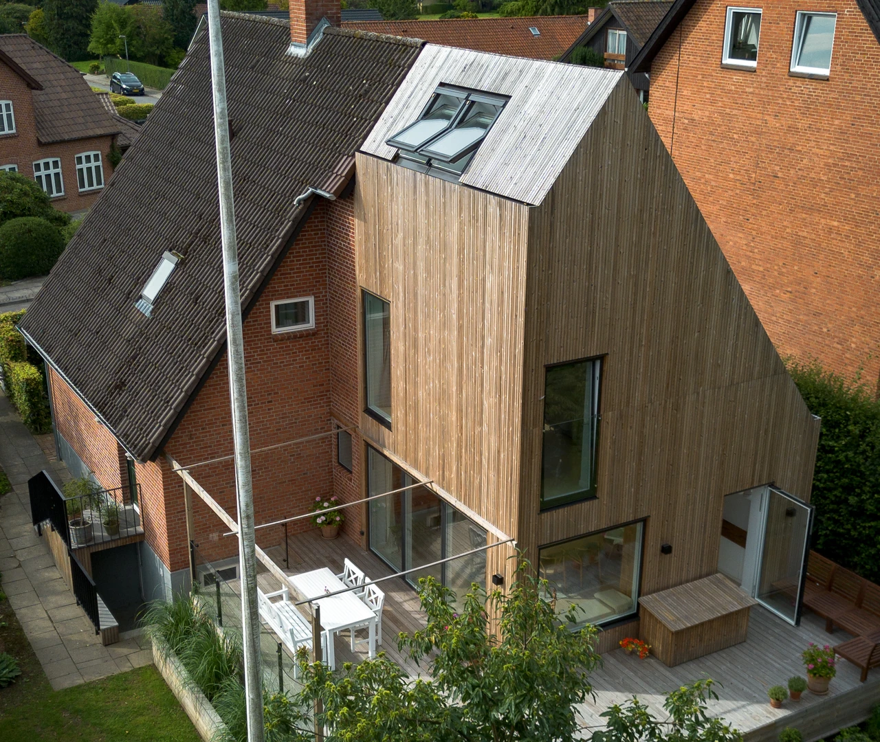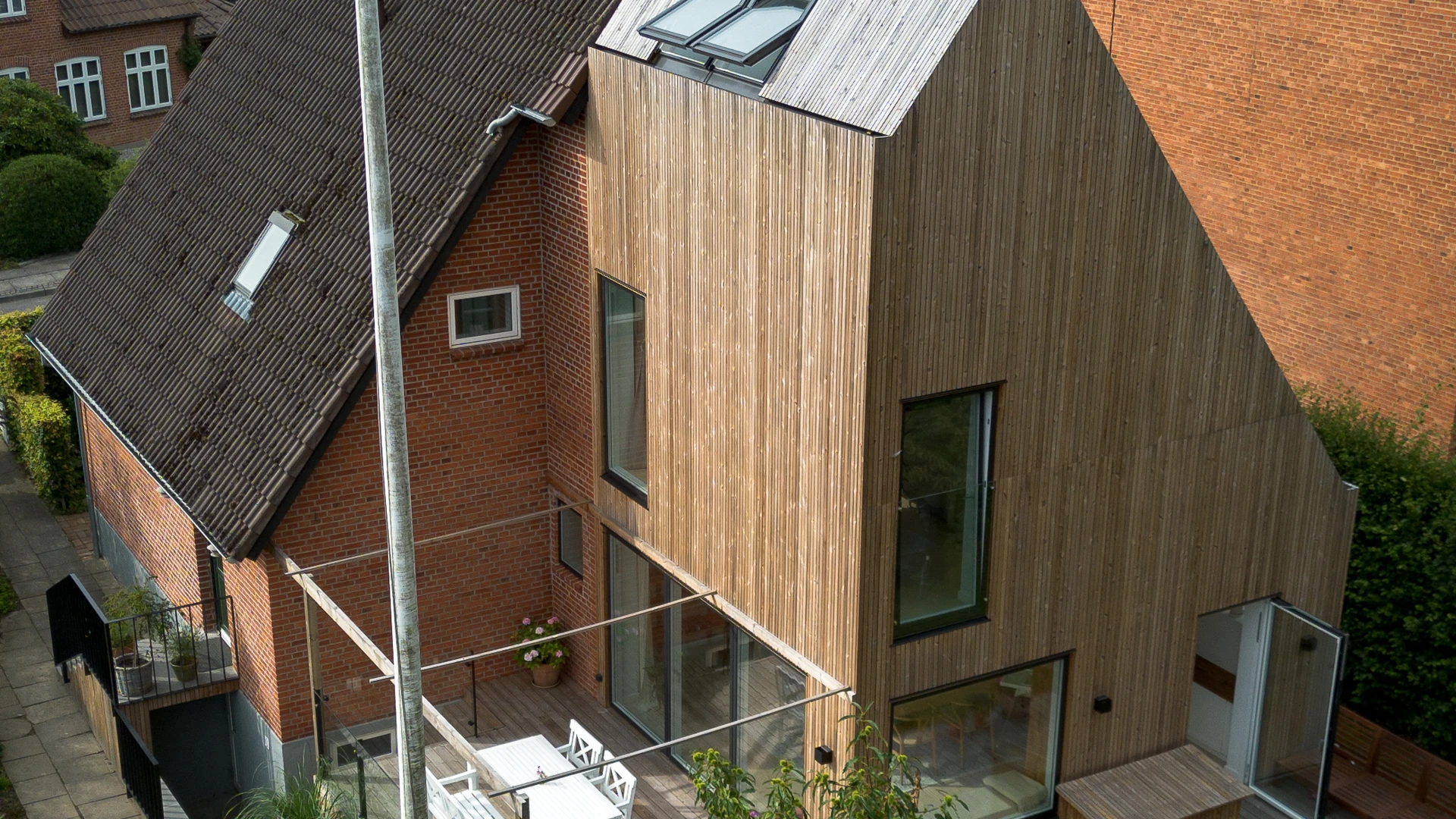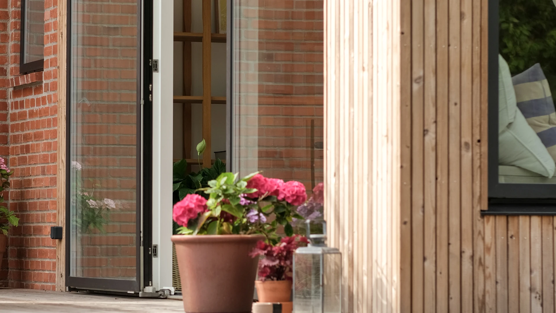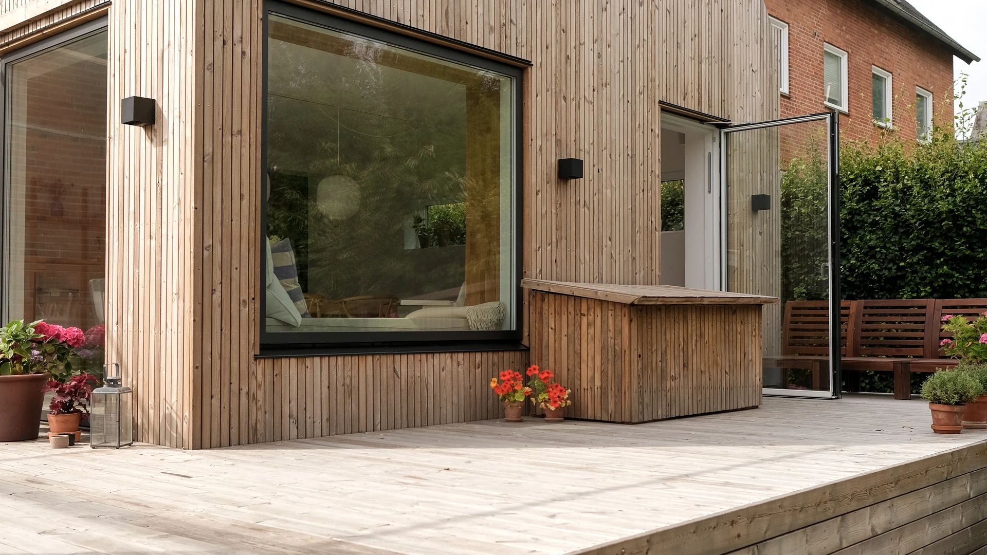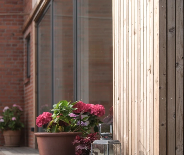 Tilbygningens strategiske udformning er tænkt ind i udelivet, da den naturligt danner to læfyldte uderum på terrassen. Dette arkitektoniske greb sikrer, at familien kan udnytte solens gang og nyde både morgen- og aftensolen i private rammer. Resultatet er en harmonisk udvidelse, der forbedrer boligens flow og udeliv.