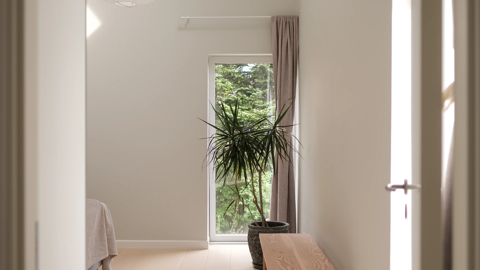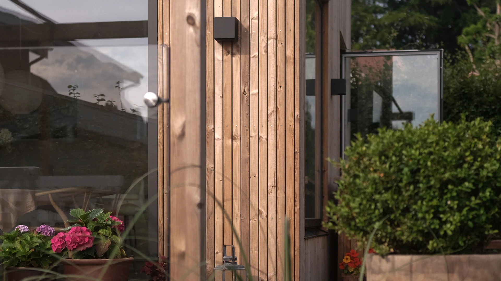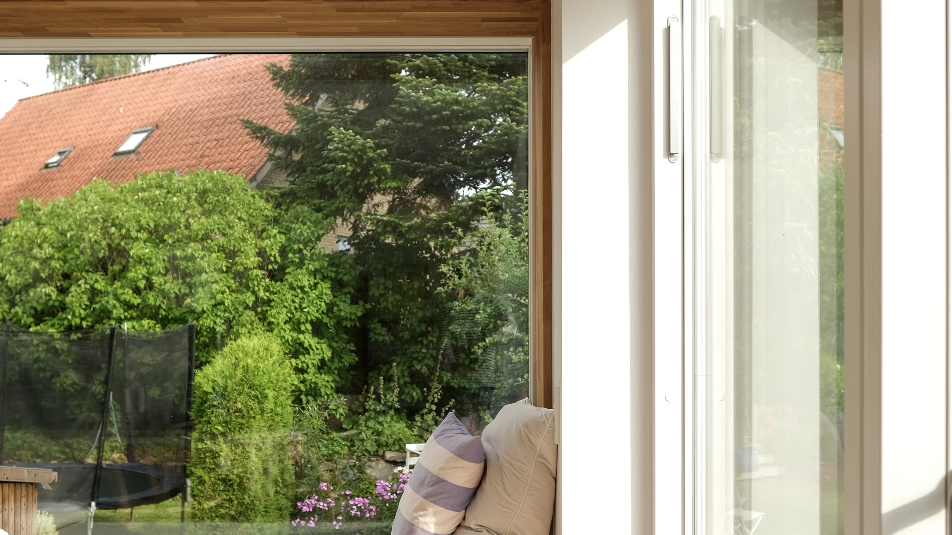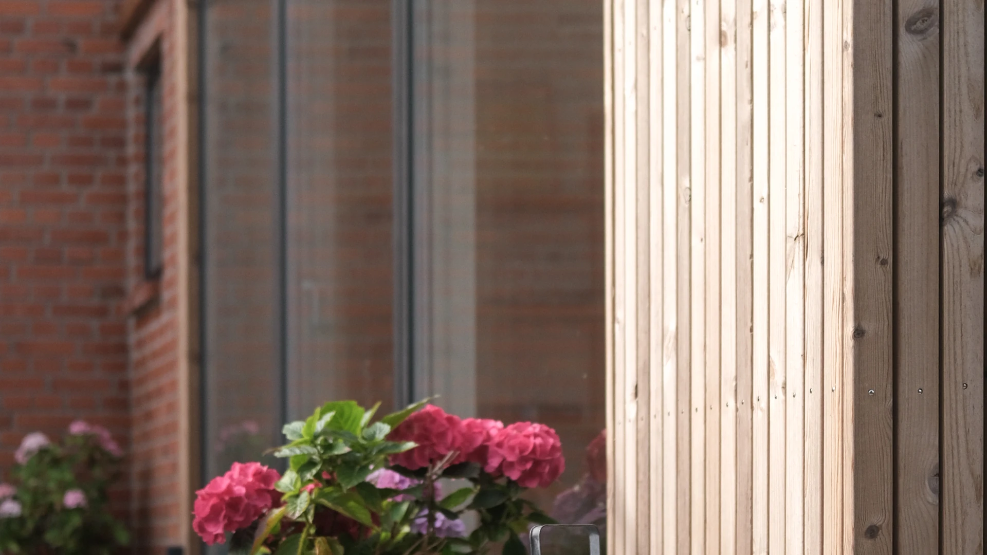 Tilbygningens strategiske udformning er tænkt ind i udelivet, da den naturligt danner to læfyldte uderum på terrassen. Dette arkitektoniske greb sikrer, at familien kan udnytte solens gang og nyde både morgen- og aftensolen i private rammer. Resultatet er en harmonisk udvidelse, der forbedrer boligens flow og udeliv.