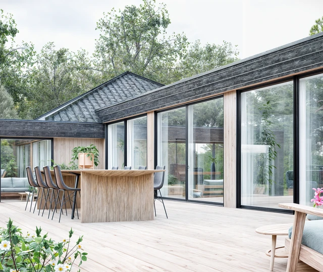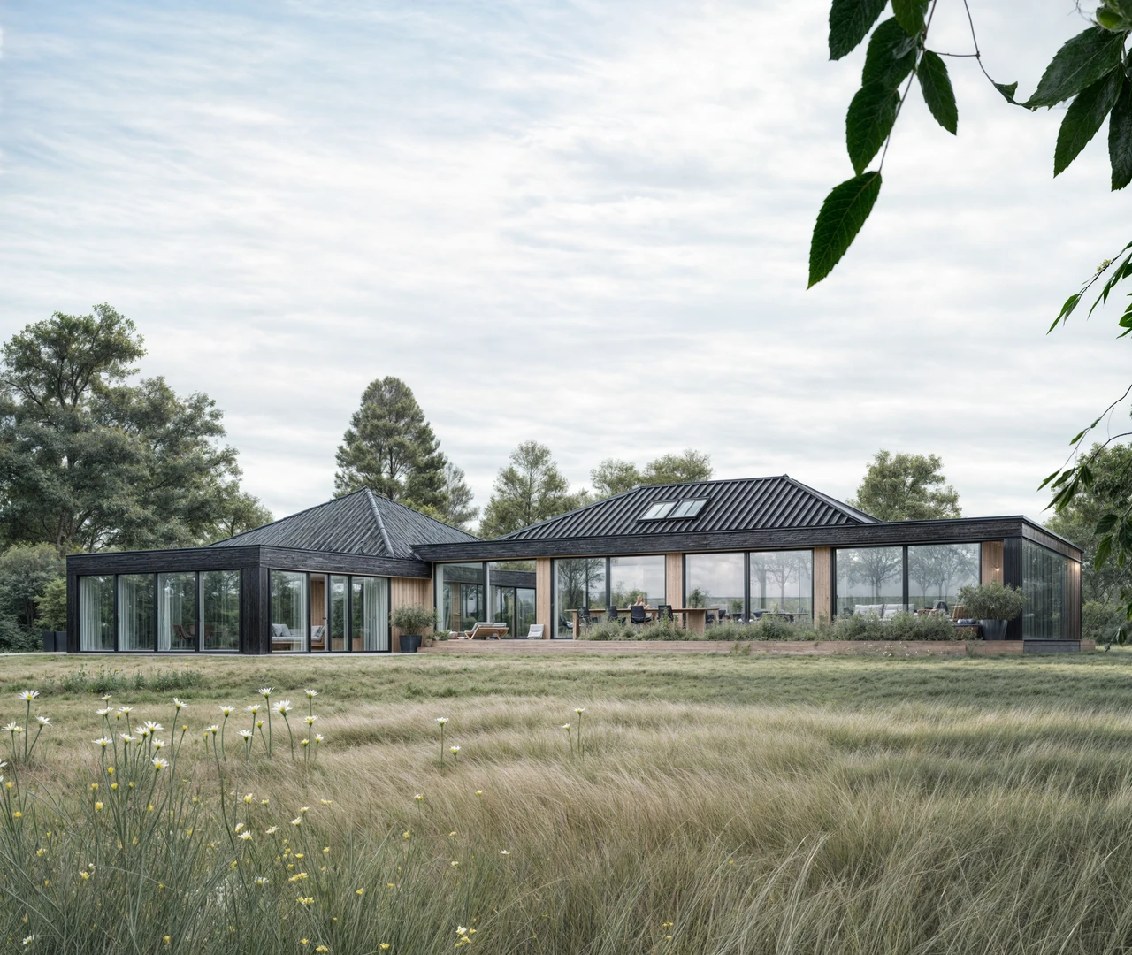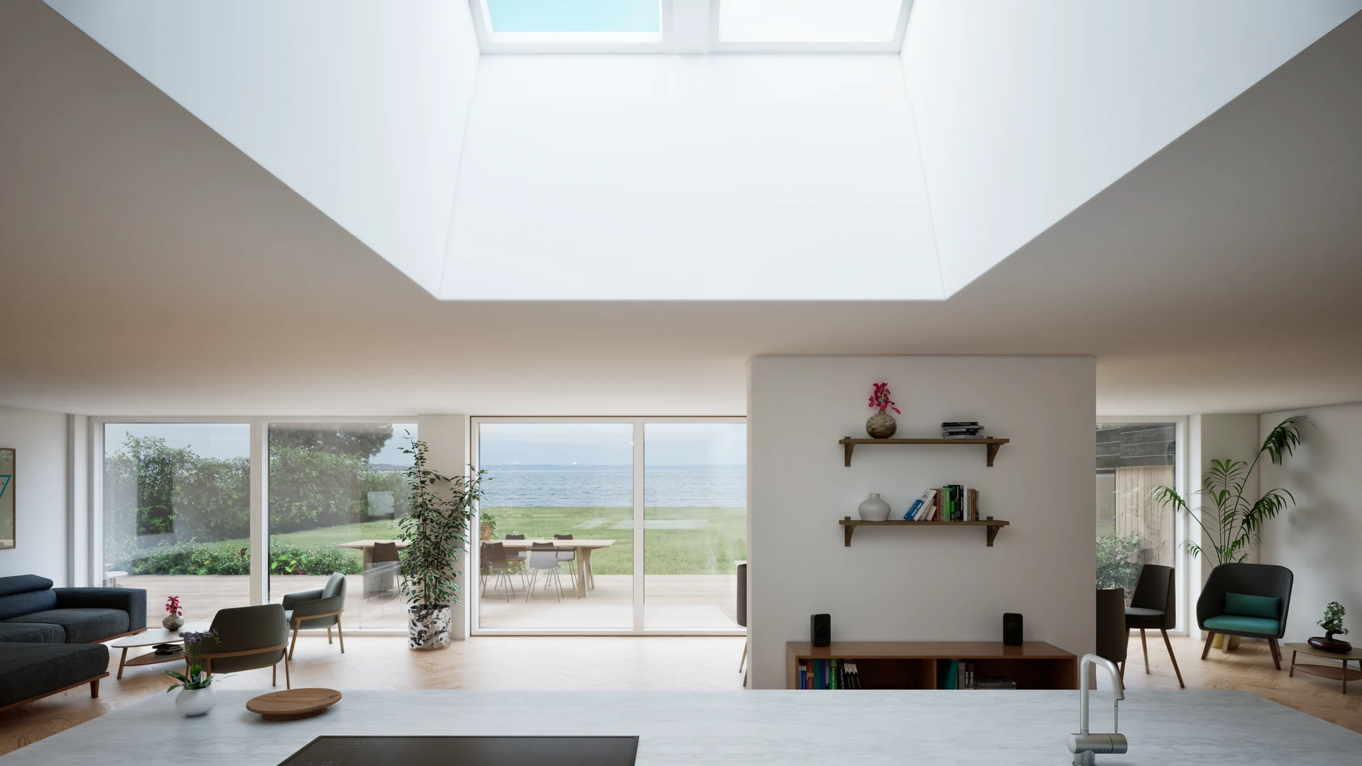 Gennemgående store glaspartier sikrer, at den panoramiske udsigt over bæltet udnyttes optimalt og integreres i alle hjemmets vigtigste rum.