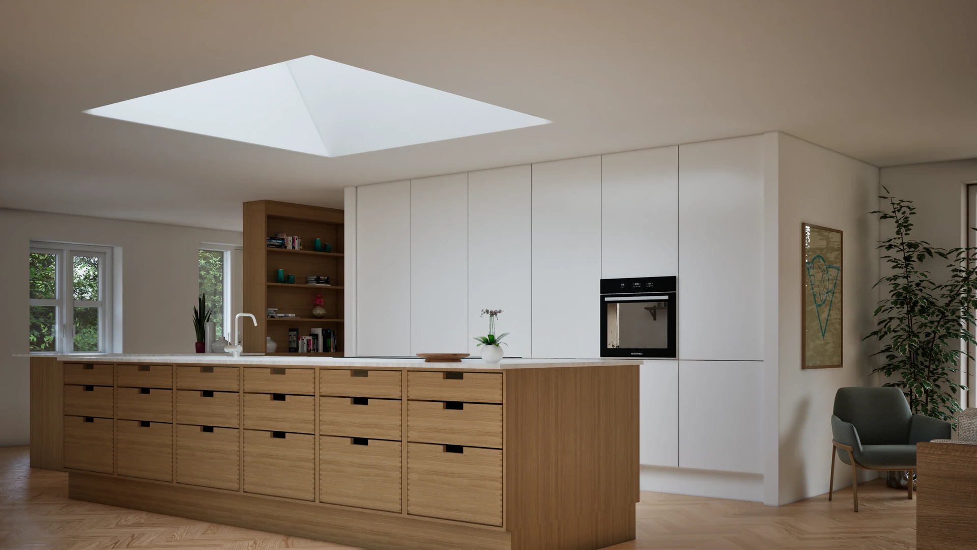 Udvidelsen tilfører boligen et elegant orangeri, nye opholdsrum og en eksklusiv forældreafdeling med walk-through og stort badeværelse. I husets kerne er der skabt plads til familiens samvær i et rummeligt køkken-alrum, som ligger i åben forbindelse med stue og spiseplads.