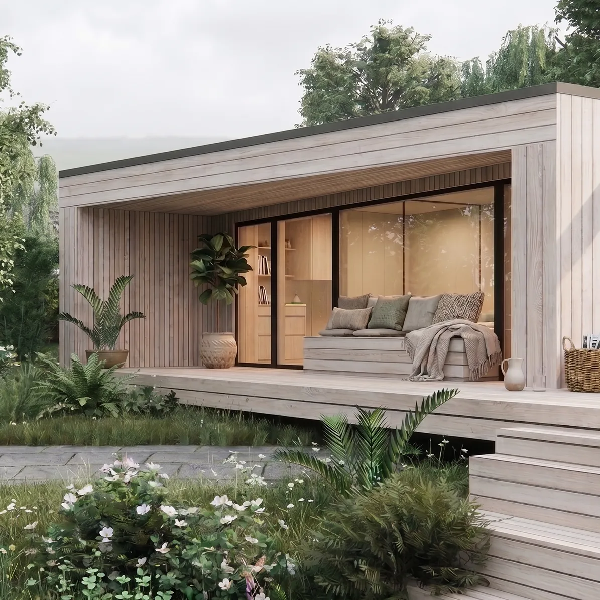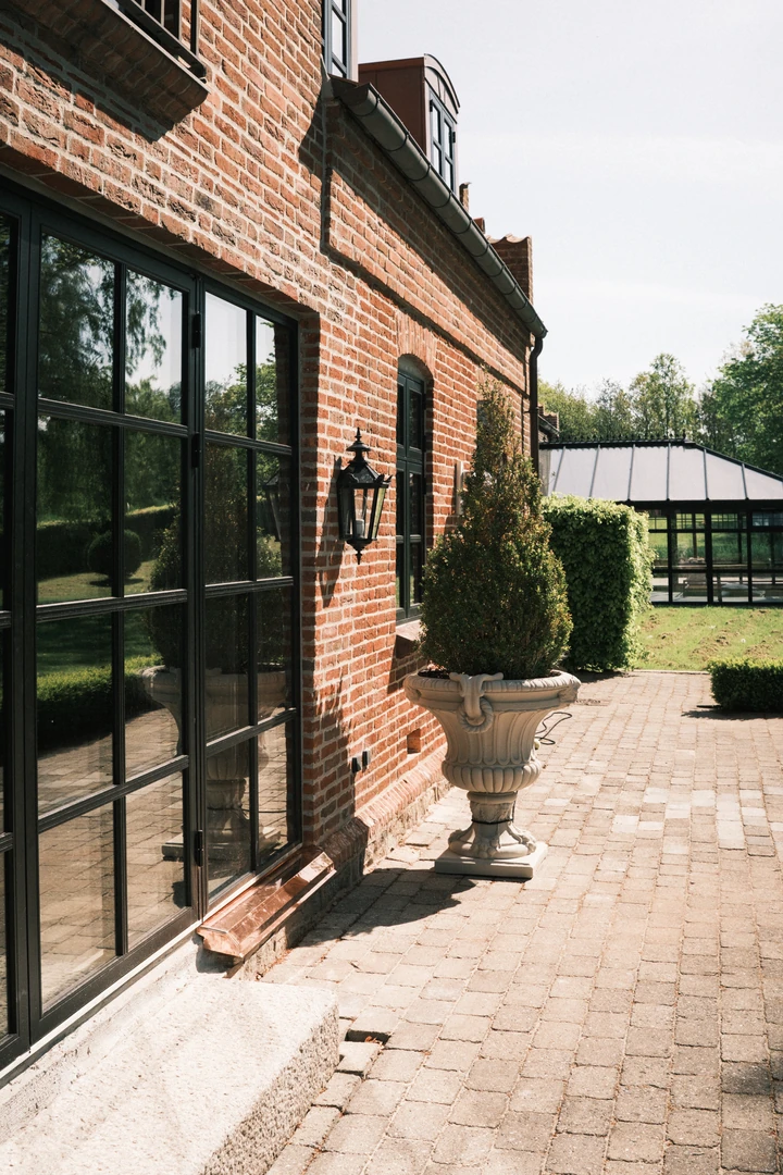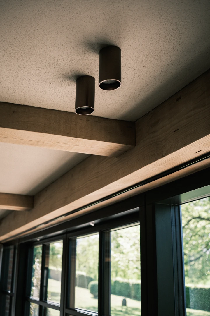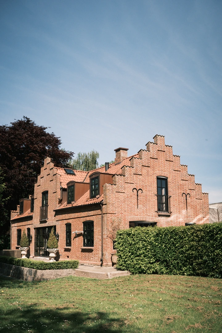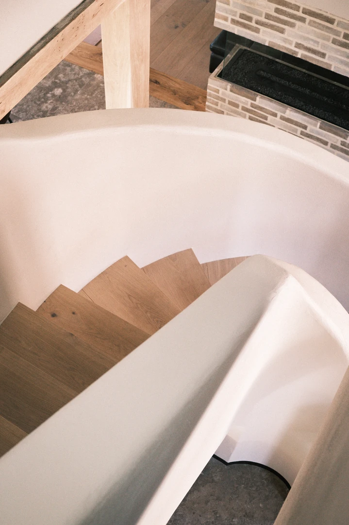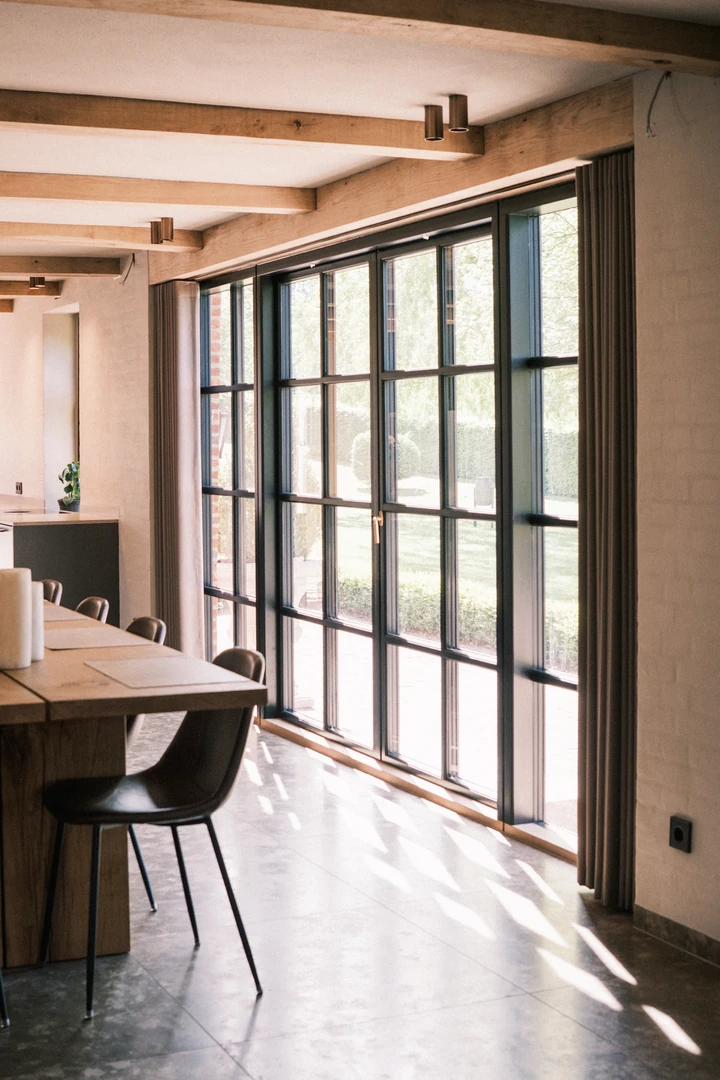 Indretningen er præget af kompromisløse materialevalg, herunder massive egetræsbjælker, rå natursten og en skulpturel, buet trappe, der vidner om elegant detaljerigdom. Store, sprossede vinduespartier trækker haven helt ind i de åbne leverum, hvor originale detaljer og moderne komfort skaber en harmonisk helhed.