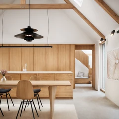 I renoveringen har vi foreslået en ny placering af husets trappe. Den centrale placering af trappen giver sammen med en større åbning til førstesalen en bedre forbindelse mellem køkken-alrum og hjemmets førstesal. I renoveringen er der blevet åbnet op til kip for fuld udnyttelse af husets højde og synliggørelse af husets konstruktion.